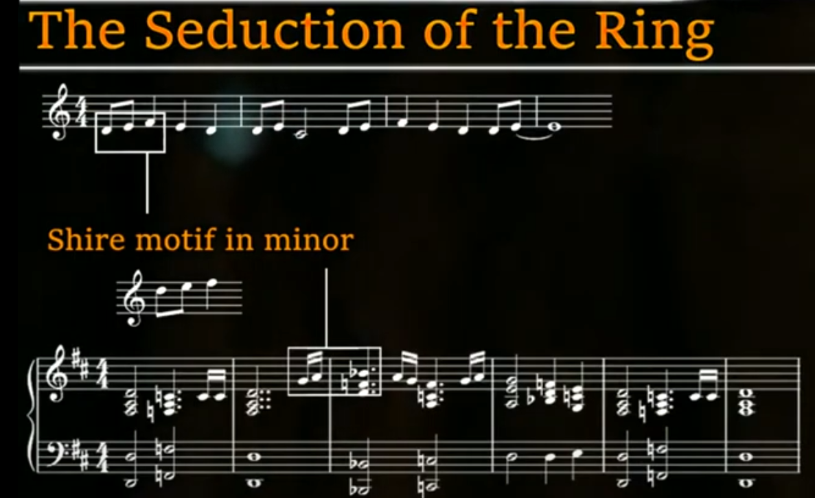 | 1.02 | The Shire The Shire (Pensive Setting) 샤이어는 아마도 영화 음악에서 가장 중요한 문화이자 가장 잘 묘사된 문화일 것입니다. 우리는 세 가지 주요 배경을 만나게 될 텐데, 그 시작은 '생각에 잠긴 분위기' 설정입니다. 이와 함께 다수의 반주가 고전적인 장조의 따뜻한 화음으로 구성되어 있습니다. 이는 샤이어를 이야기의 상징적 '고향'으로 굳게 자리잡게 합니다. 이야기의 마지막 장에서도 샤이어 테마의 온전한 연주가 드물지만, 순차적으로 상승하는 세 음의 시작(레미파#~)은 모든 호빗들의 선한 본성을 상징하는 모티프로 남아 있습니다. The Fellowship Theme 각 영화에서 타이틀 카드가 등장할 때마다 가장 관련된 라이트모티프가 함께 연주되며, 이 경우에는 당연히 '반지 원정대 테마'가 사용됩니다. 조화로운 샤이어 테마와 달리, 이 테마는 대담하고 모험적입니다. 1-b3-1의 반음간 3도 진행(D-F-D)으로 시작하고, B 구절은 장조 화음 위에 단조 멜로디를 쌓아올려 감미롭지 않으면서도 웅장한 소리를 만들어냅니다. 이 테마는 서곡에서 암시된 오르내리는 전음 모티프(레-도-레)로 압축될 수 있으며, 이는 반지 원정대가 선의 중요한 힘임을 증명합니다. Hobbit Two-Step 호빗 반주들은 단순한 장조 패턴들로 이루어져 따뜻하고 때로는 장난기 있는 화음을 만들어냅니다. The Hobbit Two-Step, Skip-Beat, Outline and End-Cap 이 번갈아 가며 호빗들의 조화로운 문화를 표현합니다. 적절하게도, 호빗 반주들은 거의 샤이어 내에서만 존재하며, 이야기가 샤이어를 벗어난 후에는 그리움의 대상이 됩니다. 모르도르 반주들과는 달리, 이들은 중간계의 나머지 지역에 거의 영향을 미치지 않습니다. The Shire (Rural Setting) '전원적 분위기'는 샤이어 테마의 두 번째 형태로, 가장 소박한 버전입니다. 이 테마는 호빗들의 평화롭고 걱정 없는 일상 생활을 그리기 위해 호빗 마을에서만 사용됩니다.