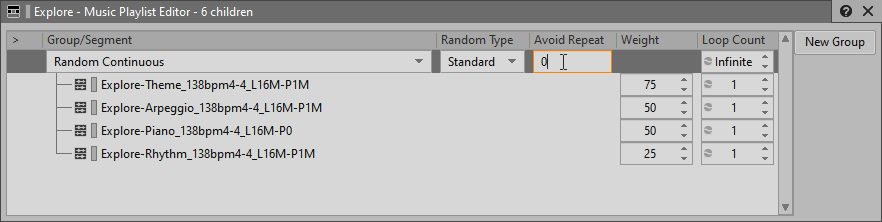 - Avoid Repeat 속성은 Music Segment가 가중치에 상관 없이 연속적으로 재생되지 않게 해줍니다. 이 값은 기본적으로 1로 설정되어 있어 가장 최근에 재생된 세그먼트가 절대 바로 다시 재생될 수 없게 되어 있습니다. 하지만 음악에서는 코러스 같은 섹션이 연달아 재생되는 것이 나쁜 일이 아닙니다. 세그먼트를 연달아 재생할 수 있게 하려면 Avoid Repeat 설정을 0으로 설정해야 합니다.