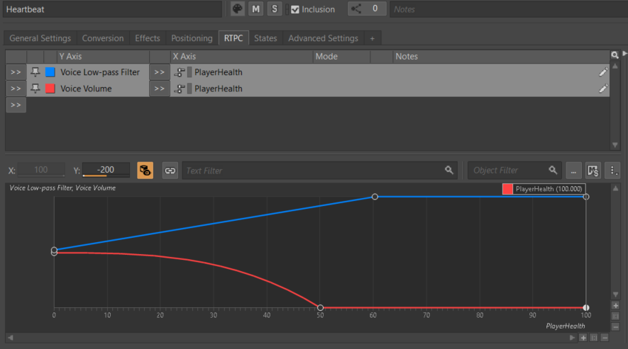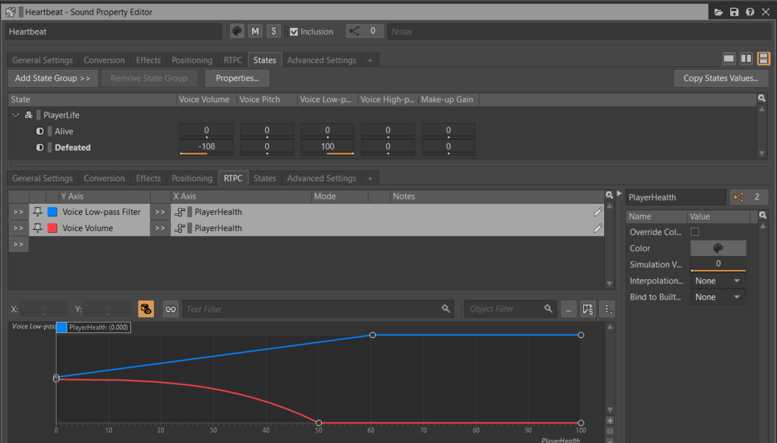 State는 게임의 전역적(global) 이벤트에 반응하여 게임 오디오를 전반적으로 변경하는 데에 일반적으로 사용되는 특수 Game Sync이다. 생사 여부, 의식의 유무, 물 위인지 아래인지. State의 상태를 사용하여 로우패스 필터 같은 오브젝트 속성값에 상쇄값을 지정하여(?) 게임의 청각적 텍스처를 점점.. 변경할 수 있다.