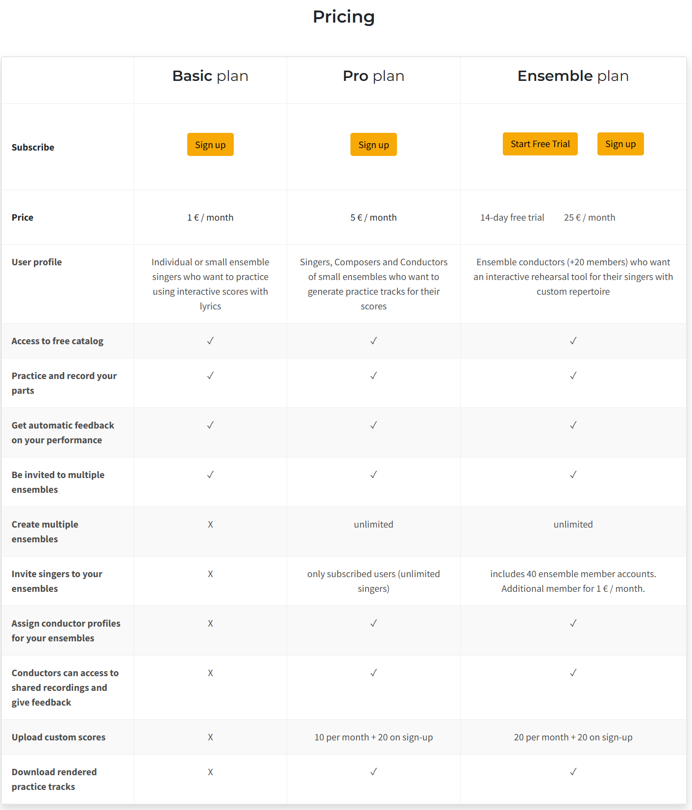 2. Cantāmus 에 해당 xml 파일을 업로드 (플랜마다 금액이 다르고, 14일 체험판을 사용해볼 수 있다)