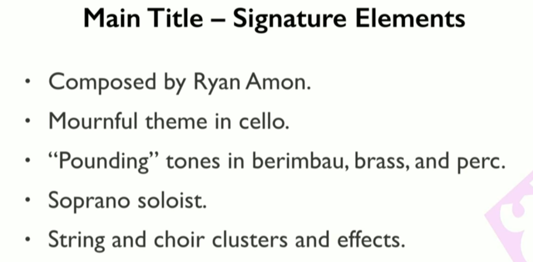 불협화음적 조성, 공포에서 영감을 받은 선율적 제스처, ‘사운드의 벽(Wall of Sound)’ 접근법, 그리고 피가 끓는 듯한 액션 음악을 논의할 것입니다.